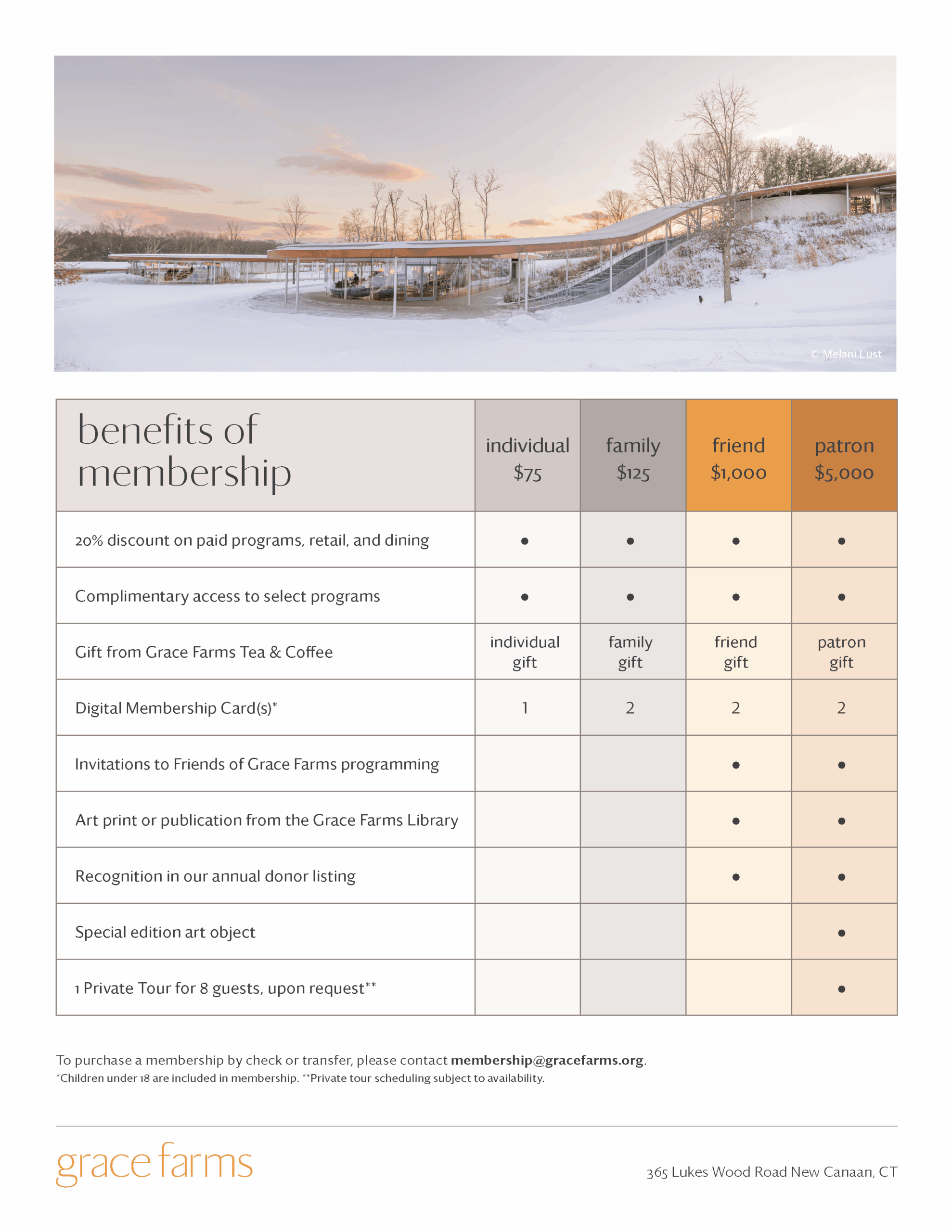 Please note that memberships and contributions are not refundable or transferable. All levels, benefits and pricing are subject to change. Membership benefits may not be transferred, exchanged, resold or refunded. Membership benefits may not be used for group visits. When you visit Grace Farms, you agree to comply with our Visit guidelines.